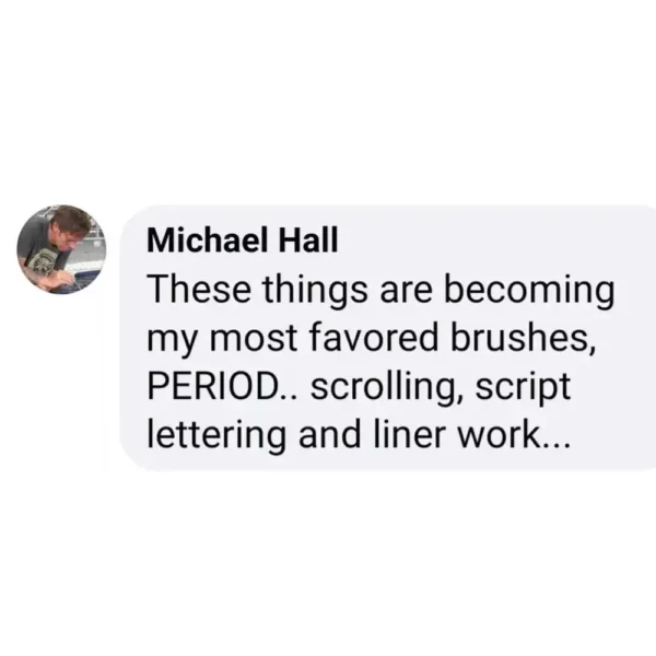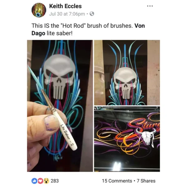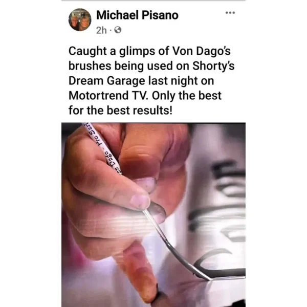 The Von Dago Pro-Series line has earned widespread respect throughout the custom paint community. Top artists—including Ryan Evans of Count’s Kustoms, Craig Fraser, and Ron Fleenor—use and recommend these brushes for their balance, flow, and longevity.
