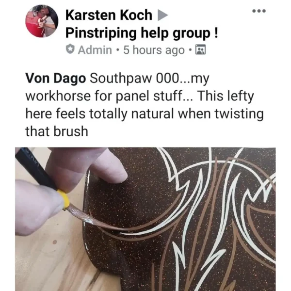 Created by Von Dago—a 50+ year custom painting veteran, multiple Hall of Fame–inducted pinstriper, and industry innovator—the Pro-Series Southpaw #000 is a purpose-built pinstriping brush made exclusively for left-handed artists. Proudly Handmade in the USA, it revives a long-lost tool once unavailable to southpaw stripers: a true left-handed sword brush engineered for comfort, balance, and precision.